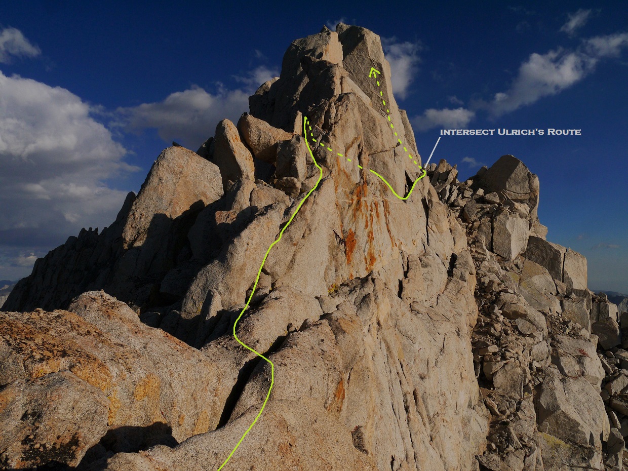 From the notch, the cracked face of Ulrich's Route (class 4) lay directly above to the left. There were many ways to climb it. Once up the face and on the ridge, the summit block lay a short distance to the right.