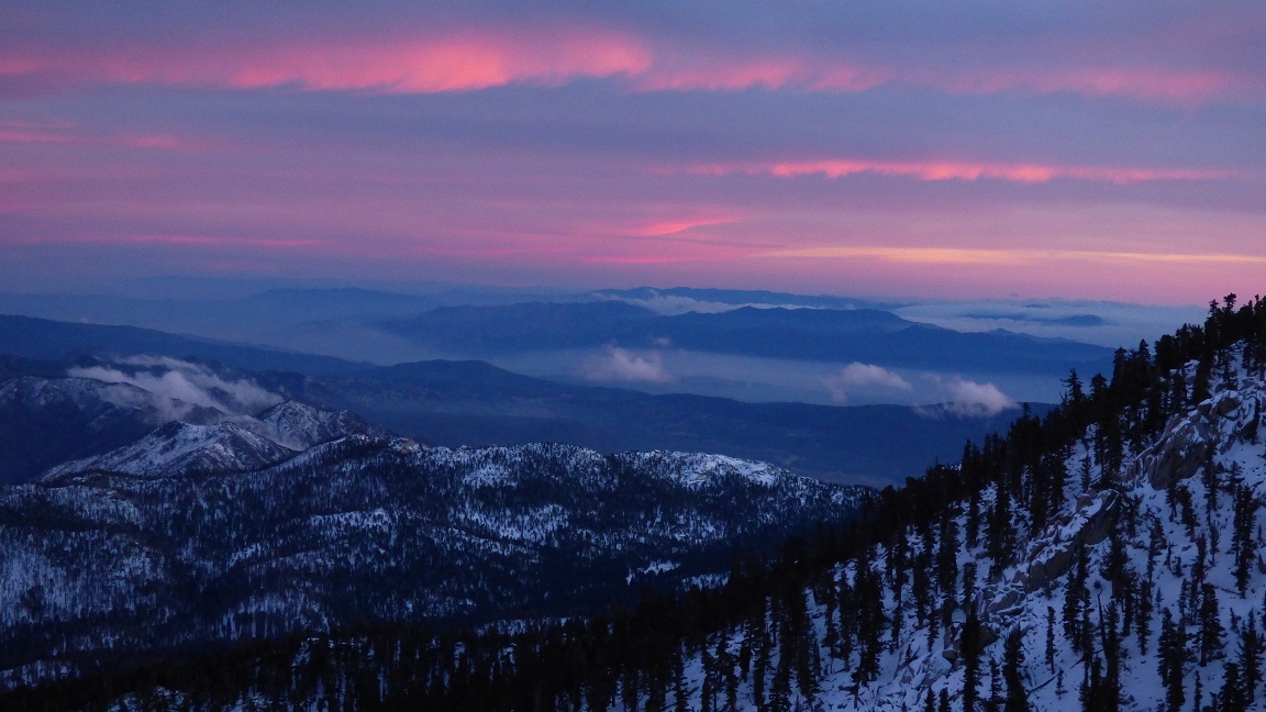 The clouds grew red as I trudged up the "great switchback" not far below San Jacinto Peak. It was an amazing sight. About a tenth of a mile before the summit, I put on all my layers and left the pack there, preparing for the arctic blast.
