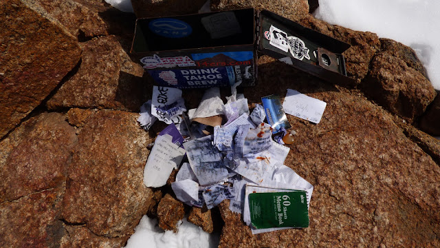 Since the northwest ridge of Freel Peak was north-facing, we toiled for nearly an hour with deep snow, and were very glad to finally reach the point between Trimmer and Star where we dropped our packs.