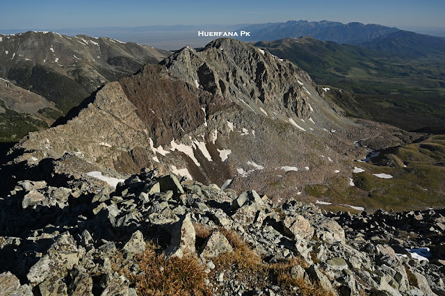 The Sierra Blanca is a sub-range of the greater Sangre de Cristo range in southern Colorado. While most of the Sierra Blanca consists of low brushy hills and gentle valleys, there's one section of it which juts up in a rapid rise of elevation. This section contains a north-facing basin which contains the headwaters of the Huerfano River, along with Blanca Peak, Colorado's 4th highest peak.